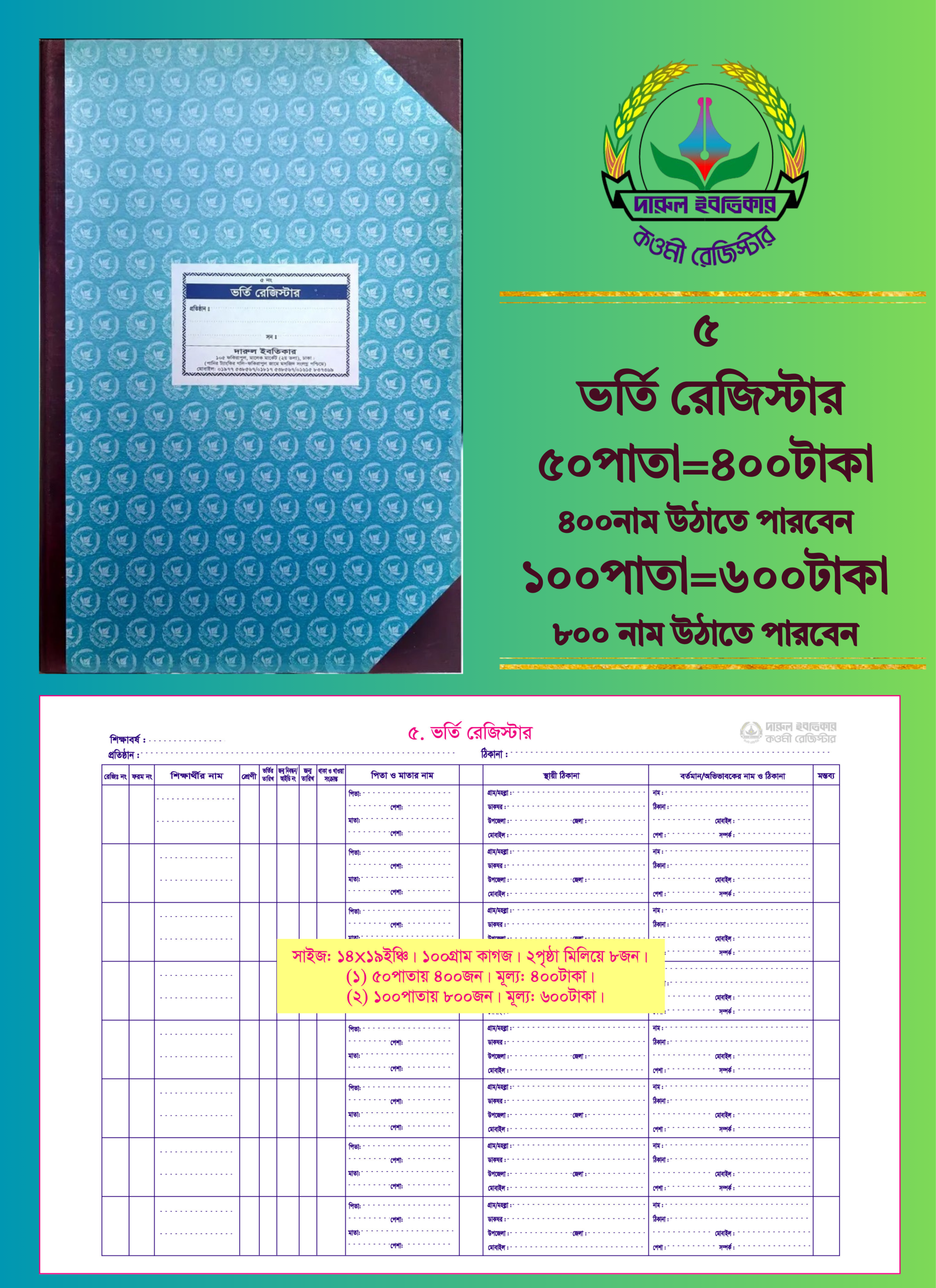 ৫. ভর্তি রেজিস্টার (৫০পাতা)