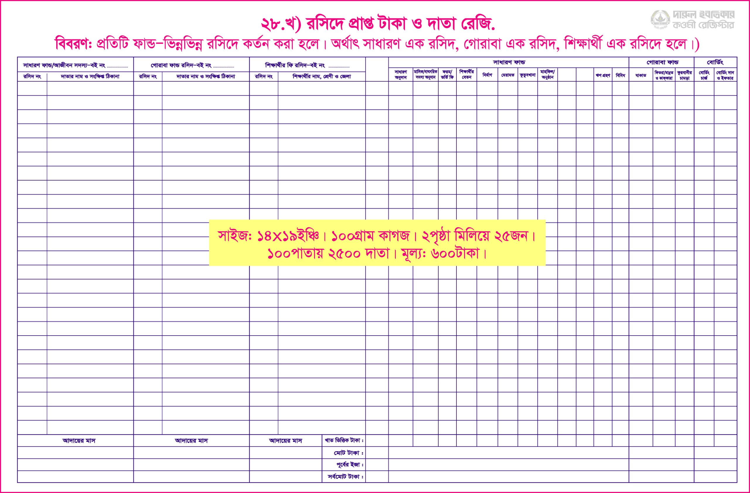২৮. খ) রসিদে প্রাপ্ত টাকা ও দাতা রেজি.